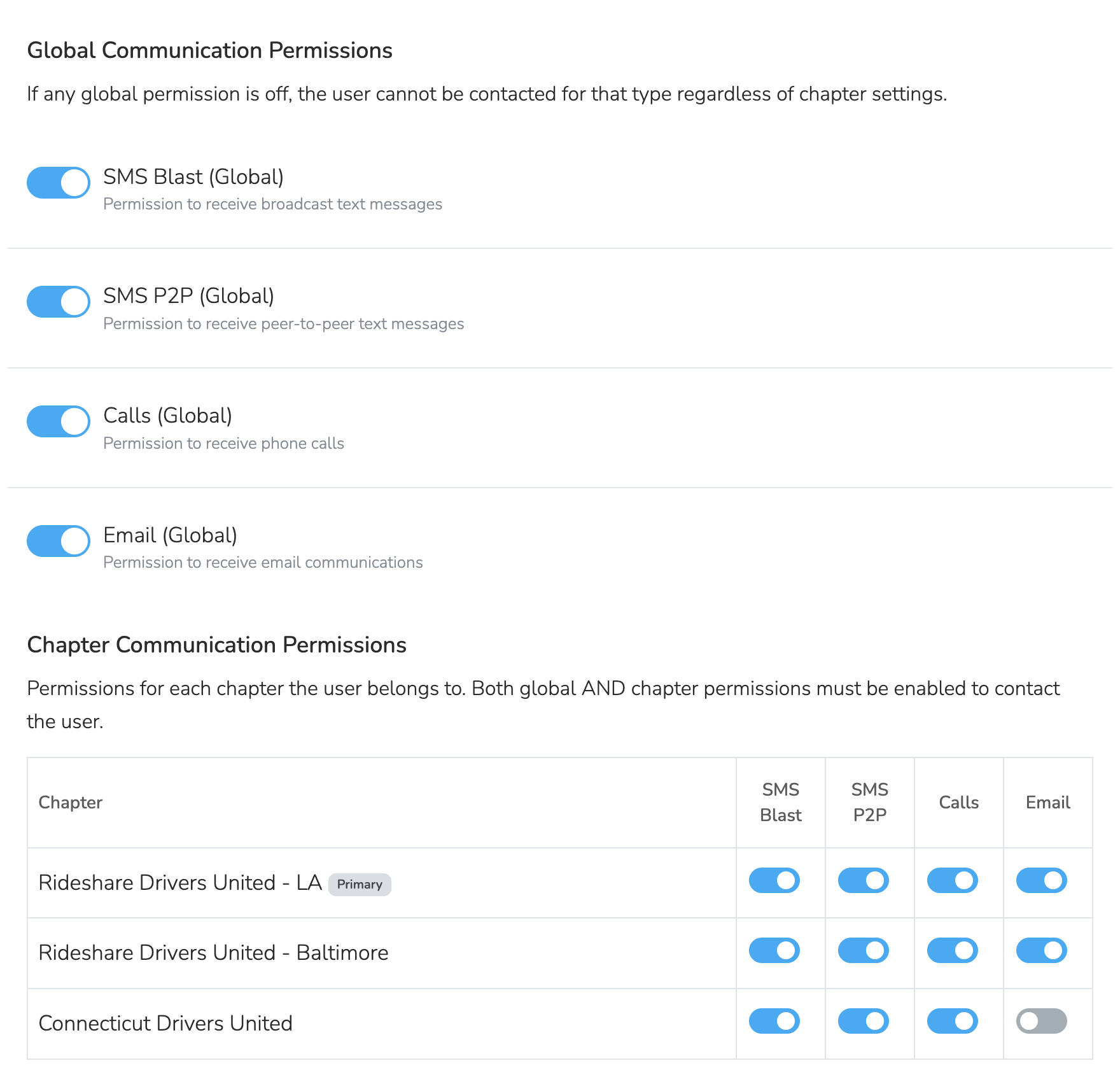 Every Person has both global permissions and chapter-level permissions for each communication type: